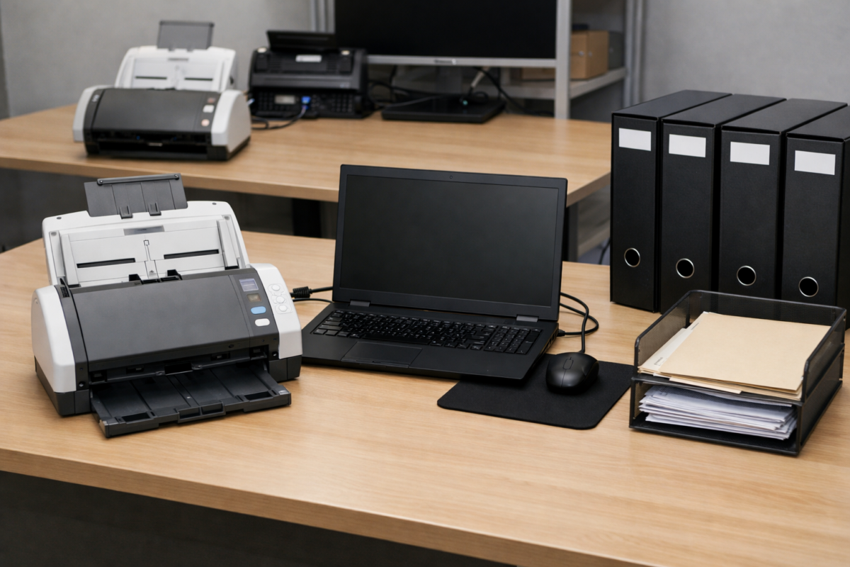 صورة توضيحية عن مكتب العمل مجهز بحاسوب وماسح ضوئي عالي الأداء